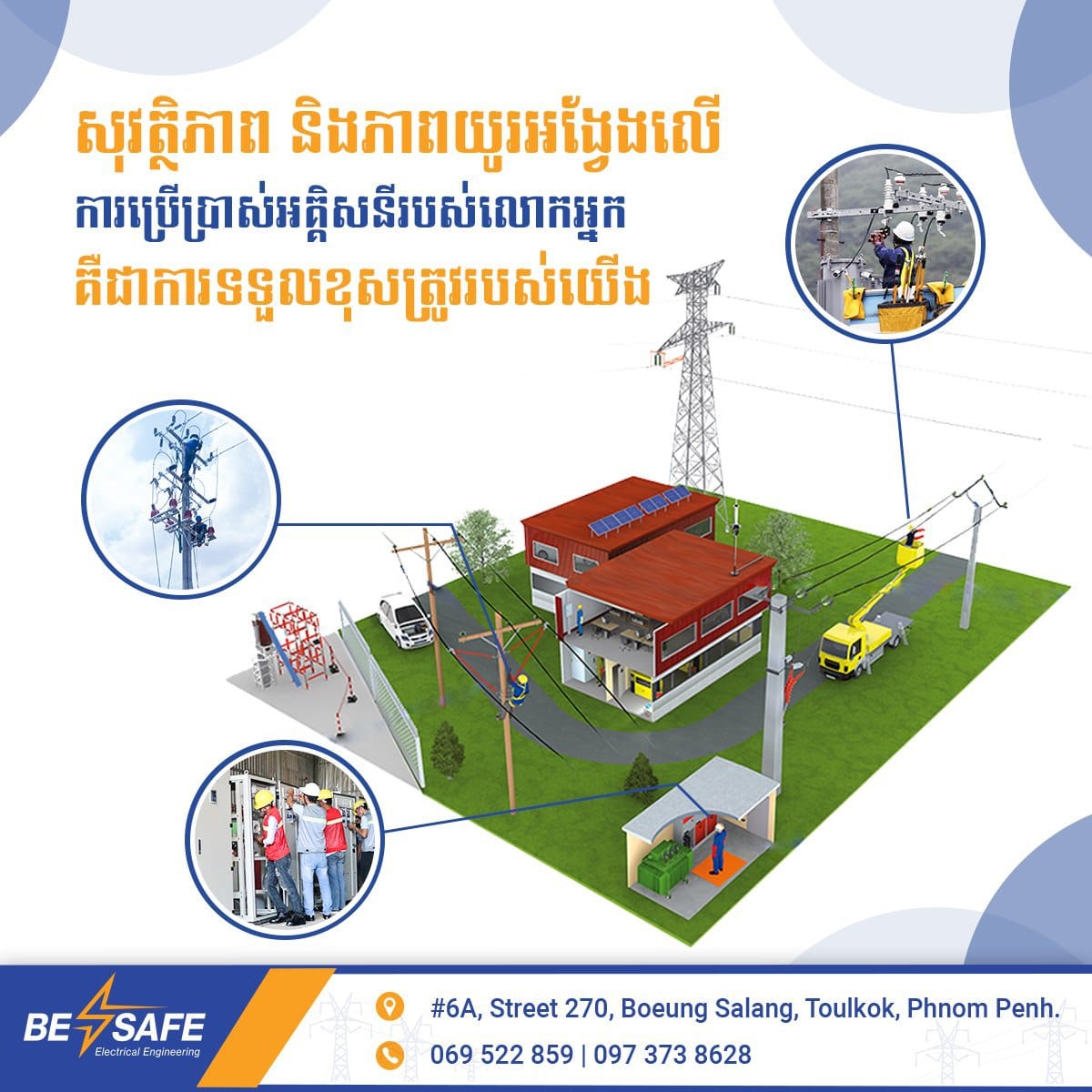 ដើម្បីរៀបចំសណ្តាប់ធ្នាប់ សុវត្ថិភាពសម្រាប់ បុរី ខុនដូ រោងចក្រ សហគ្រាស ឬផ្ទះវីឡា អគារអាជីវកម្មរបស់លោកអ្នក ត្រូវបានធានាសុវត្ថិភាពពីប្រព័ន្ធអគ្គិសនីរបស់ Be Safe Electric ដែលរៀបចំឡើងដោយវិស្វករជំនាញ សុទ្ធសឹងតែមានជំនាញច្រើនឆ្នាំ និងជាវិស្វករ ដែលទទួលបានការបណ្ដុះបណ្ដាលចេញពីសាលាល្បីៗនៅប្រទេសកម្ពុជា។